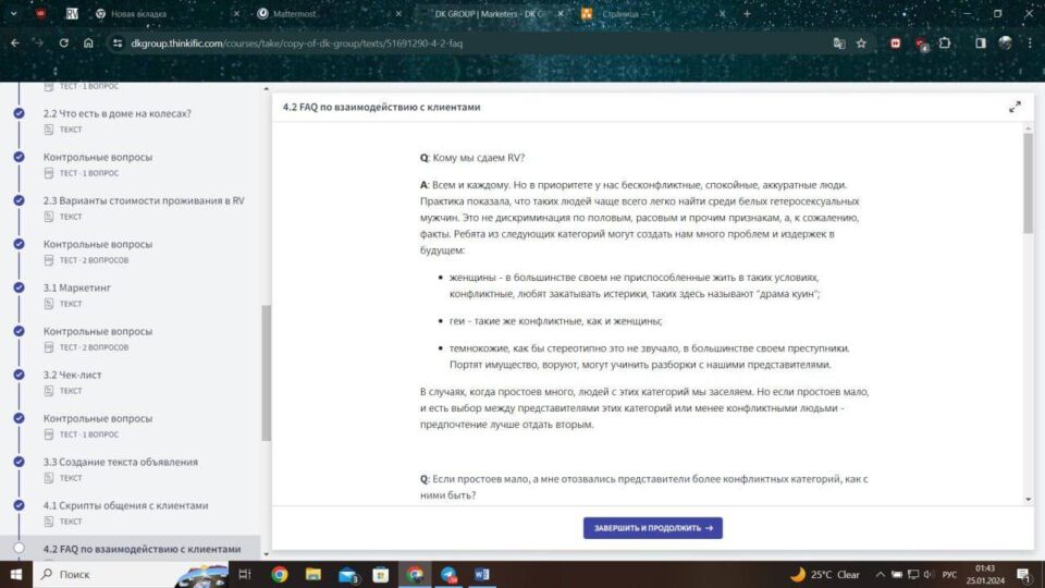 В документе также указано, что сотрудники DK Group должны делать, если на объявление об аренде жилья отозвались представители «конфликтных категорий». Так, компания советует своим сотрудникам «ссылаться на мифического человека, который хотел съехать, но что-то передумал», заявить о том, что бронь на жилье поступила прямо перед обращением клиента, не говорить о других возможных вариантах заселения и длительное время не отвечать на сообщения клиента для того, чтобы у него пропал интерес. В случае с женщинами инструкция говорит ссылаться на занятость женских номеров.
