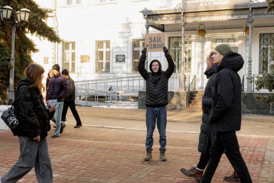 В Нижнем Новгороде двое студентов Мининского университета вышли к зданию вуза с плакатами, на которых было написано: «Зай, рожай!». Пост с фотографиями студентов был опубликован в паблике «Подслушано Нижний Новгород».